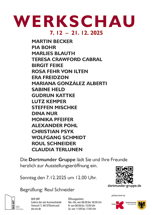 Die Begrüßung erfolgt durch Sabine Held, 2. Vorsitzende der Dortmunder Gruppe. Gudrun Kattke, Künstlerin der Dortmunder Gruppe, eröffnet die Ausstellung mit einer performativen Annäherung an das Thema Unendlichkeit als "MAMA ROTTURA".